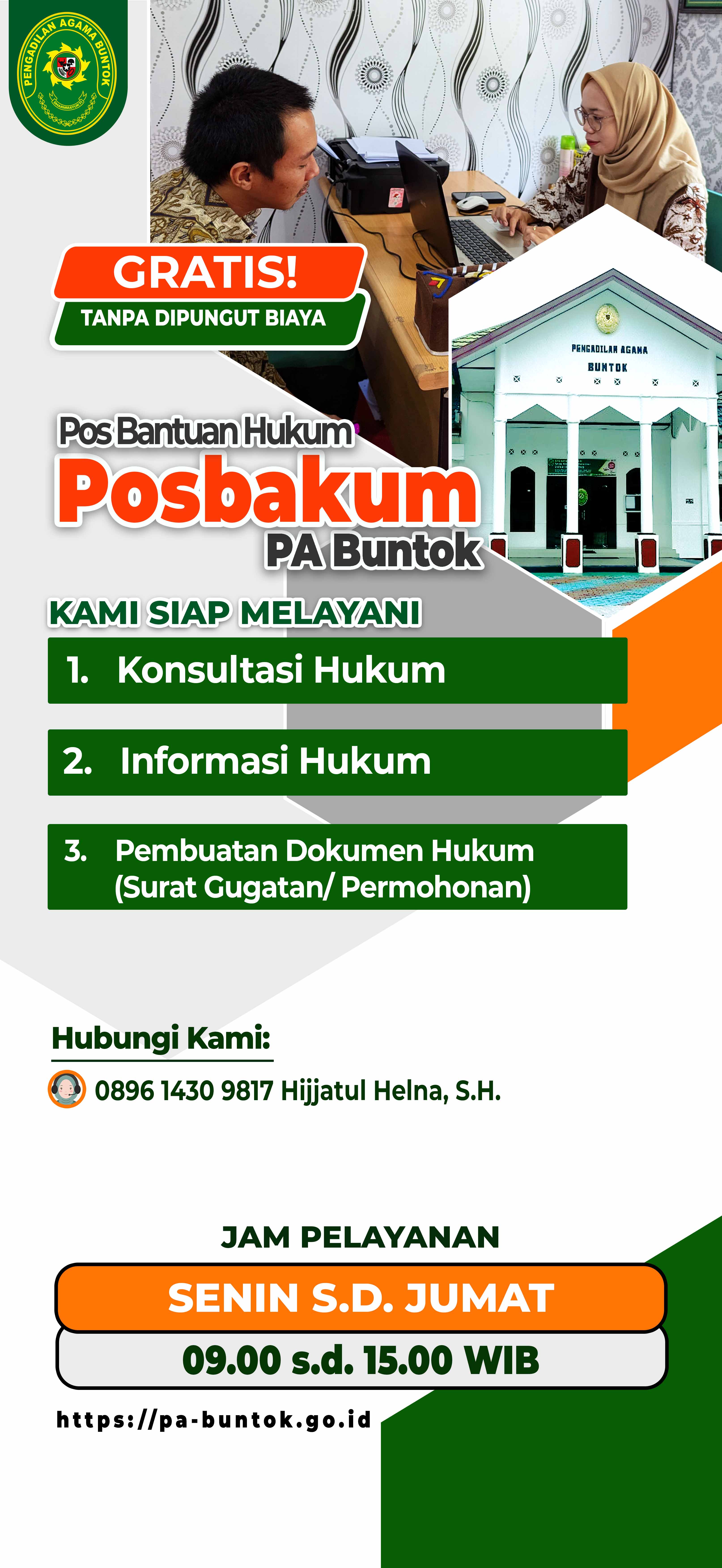 Sejak awal Tahun 2026 Pengadilan Agama Buntok telah menyediakan layanan Pos Bantuan Hukum (POSBAKUM) bekerjasama dengan Lembaga Bantuan Hukum Peduli Hukum dan Keadilan berdasarkan dengan Perjanjian Kerjasama dan Surat Perjanjian Nomor: 3/SEK.PA.W16-A4/PL1.1.5/I/2026